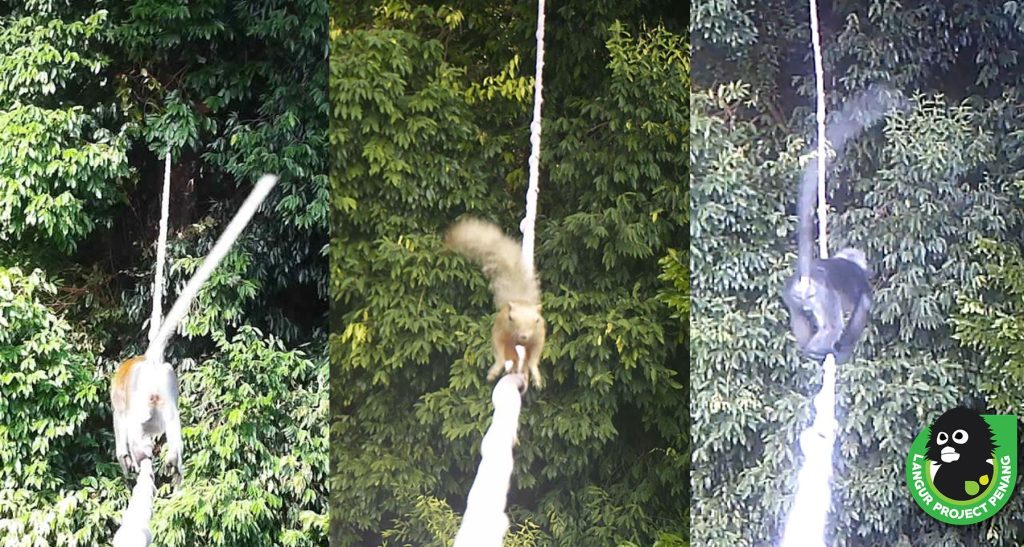 The animals are long-tailed macaque, plantain squirrel, and dusky langur