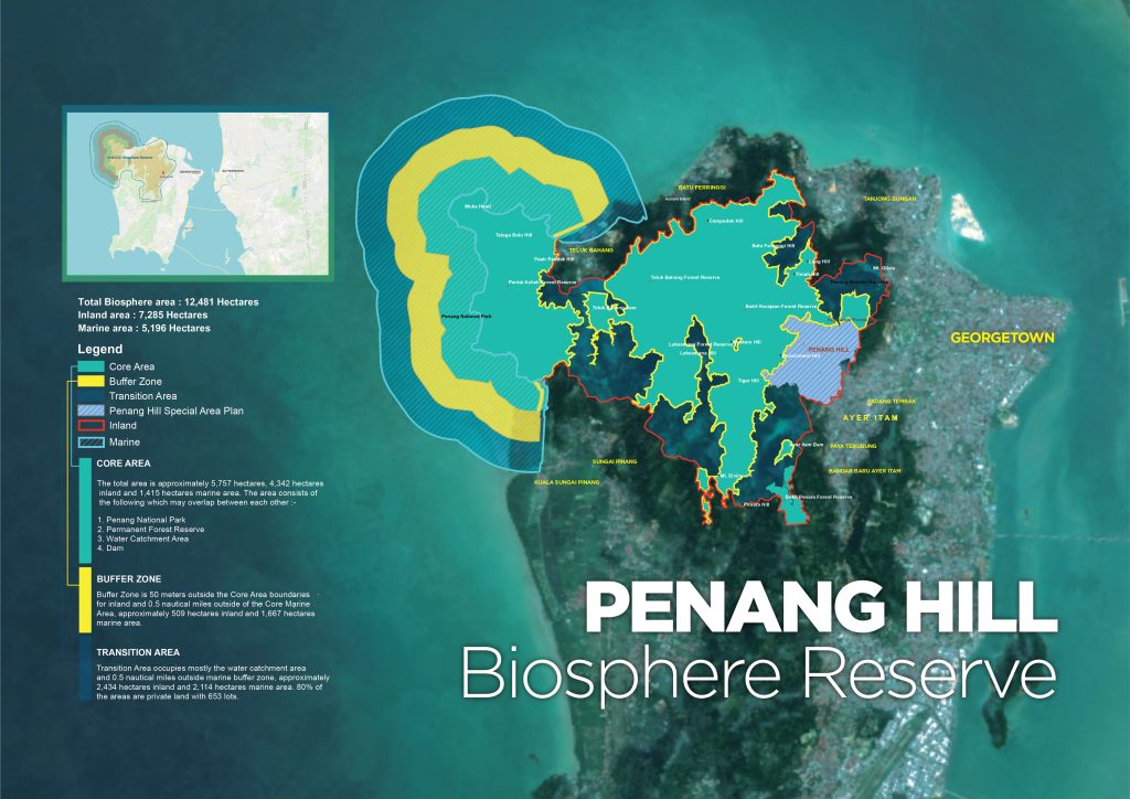 The Penang Hill Biosphere Reserve is a core of ristine natural landscapes and it is centred on the forest block of hill forest at elevations of approximately 800 metres asl. which gradually meld into lowland dipterocarp forest, coastal forest, mangroves, sandy beaches and marine ecosystems.