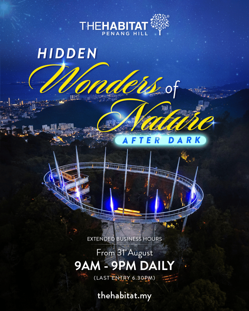 There is no additional charge for the extended hours; it’s included with the Standard Entrance Pass, which gives you a full-day entry to The Habitat Penang Hill. Stay all day and enjoy the sights, or come later to experience the park after dark.