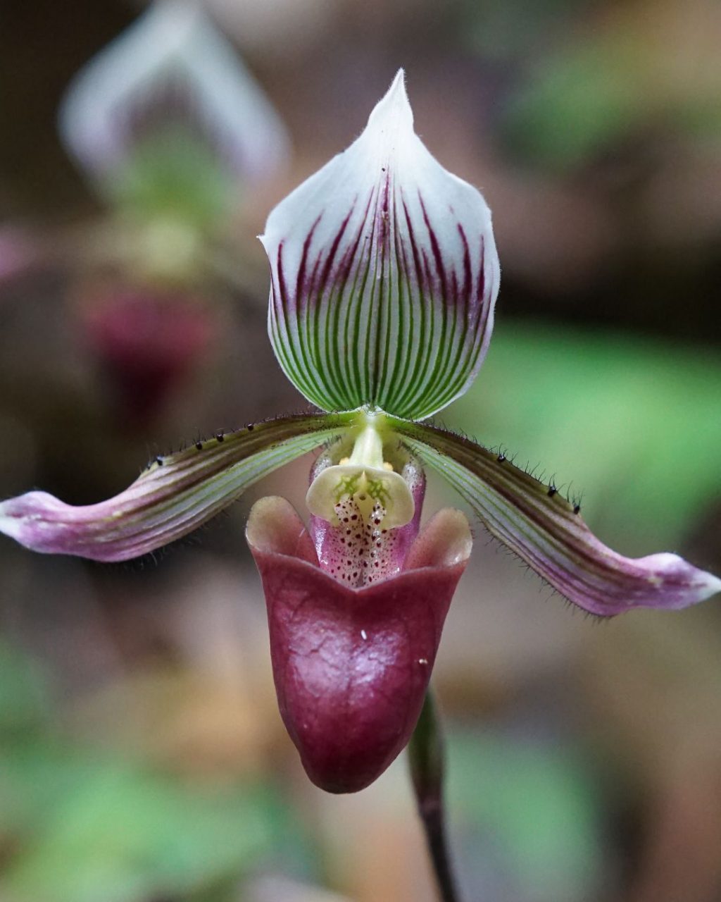 Paphiopedilum barbatum Commonly known as the Penang Slipper Orchid, this elegant species is easily recognized by its pouch-shaped lip, making it one of the Hill’s most unique orchids. Native to Penang and surrounding region, it is found on mossy rocks and damp areas of the forest. |