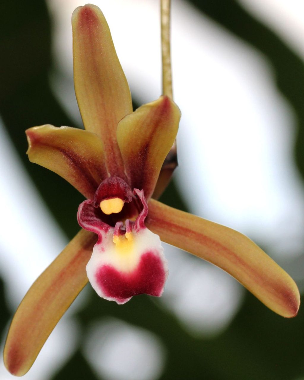 Cymbidium finlaysonianum This graceful orchid often found perched on tree trunks and rocks, produces long, cascading spikes with mildly fragrant flowers. Its greenish-yellow petals and distinct red-and-white lip, make it a captivating sight in the wild. |